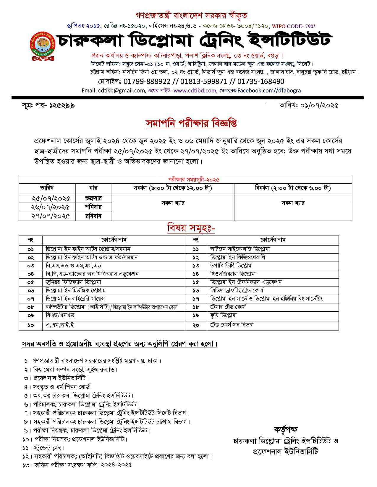 | প্রফেশনাল সকল কোর্সের পরীক্ষা ২৫/০৭/২০২৫ ইং তারিখে অনুষ্ঠিত হবে, সংশ্লিষ্ট ছাত্র-ছাত্রীদের যথা সময়ে উপস্থিত হওয়ার জন্য জানানো হলো। |
